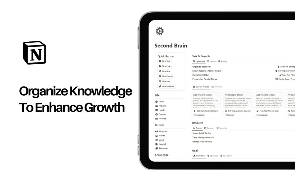Inspired by the concept of a "second brain," it features sections for notes, tasks, goals, and resources, ensuring you never lose track of important information.