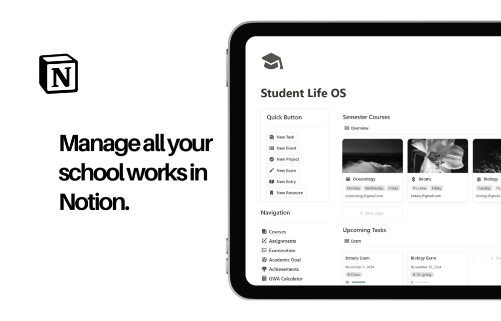 A comprehensive Notion template to help you manage your coursework, track your grades, and stay on top of your academic goals.
