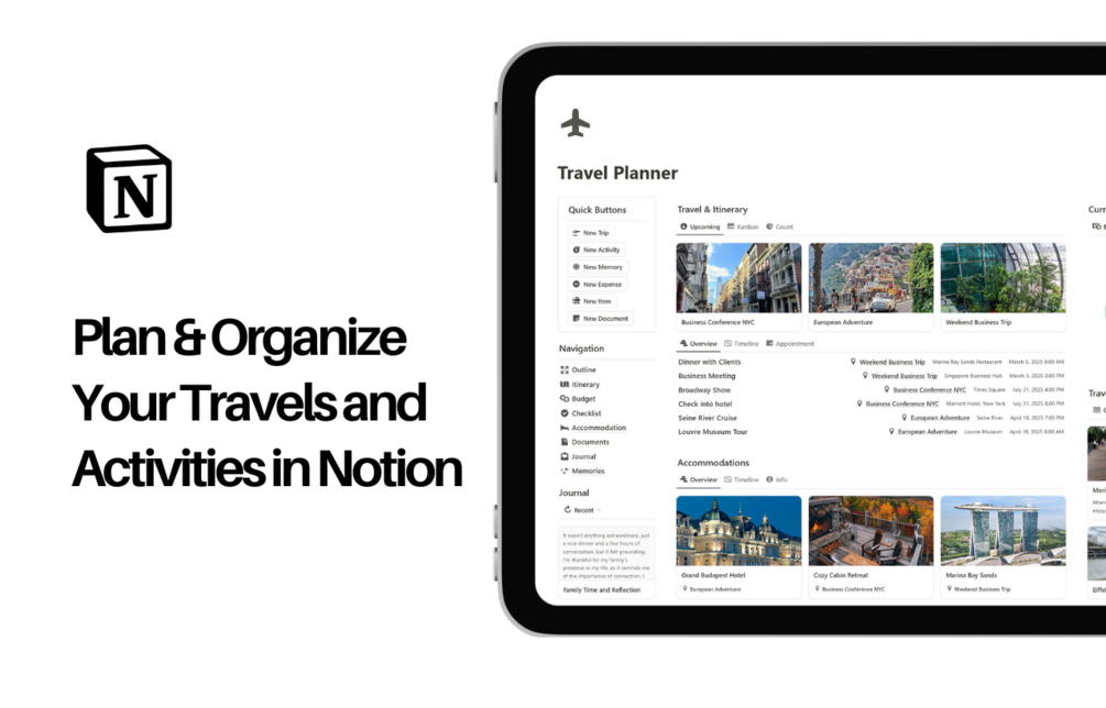 Perfect for adventurers and organizers who want to plan trips with ease. It features sections for creating itineraries, tracking budgets, and organizing travel details like flights, accommodations, and activities.